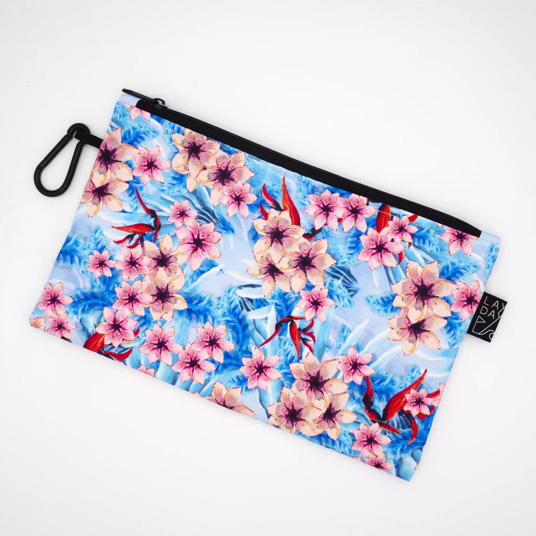 Large Hawaiian Flowers edition pouch. Dimensions 31cm * 18.50cm. Carabiner to hang it on your bag.